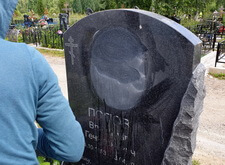 В данном заказе нам предстояло заменить теневой портрет покойного прямо на кладбище, обойдясь без демонтажа и транспортировки надгробья. Действительно, фотография, выгравированная на памятнике, была, во-первых, сомнительного качества, а, во-вторых, на ней с трудом угадывались черты лица покойного.